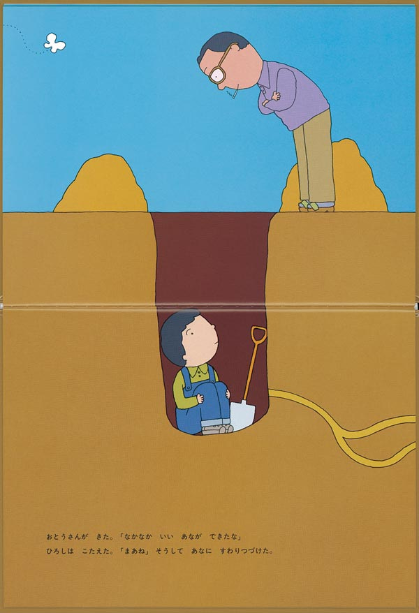 ‘On Sunday morning, Hiroshi has nothing to do so he started digging a hole. Soon the hole was deep enough for Hiroshi to sit in. He sat at the bottom of the hole and looked up at the sky. The sky looked different from the bottom of the hole. There is no purpose or reason, and it’s fine to have an adventure like this. ‘