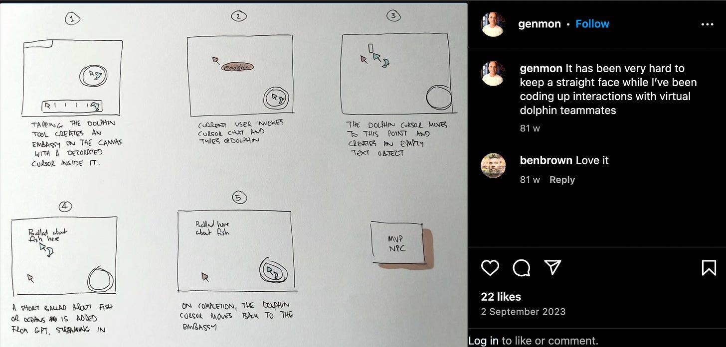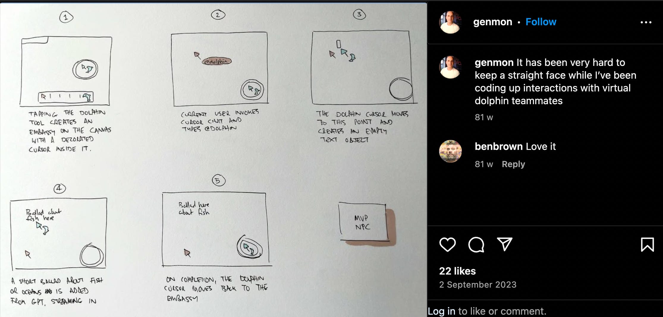 Virtual dolphin teammates: early on at Canva myself and a small group pitched ‘disco mode’. A disco ball collaborator that would join, and literally jam, in your whiteboard. Sadly, it was never prioritised but I haven’t given up on small novelty moments like this that could, very well, boost creativity (and mood).